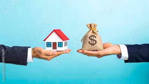 Fototapeta - Real estate transaction concept with house and money bag held by business hands