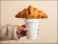 A crispy croissant is placed on top of a white coffee cup held by a warm hand.