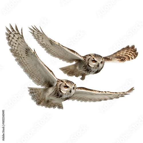 >Naklejka na meble>Two owls flying side by side in synchronized motion and one slightly ahead and wings mid-flap and isolated white background Batch realistic clean bright simple modern stock image isolated on plain