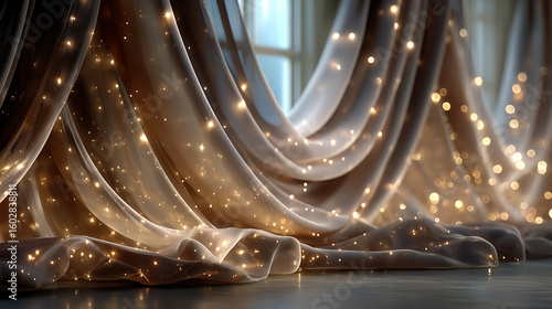 Fototapeta - Elegant draped sheer curtains with warm twinkling lights