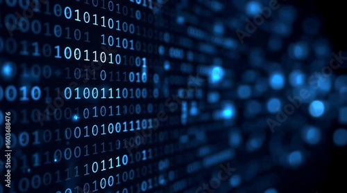 >Naklejka na meble>ฺBlue digital binary data on computer screen. dark blue abstract background featuring glowing white and light blue binary code on the left side, with a shallow depth of field creating a blurred