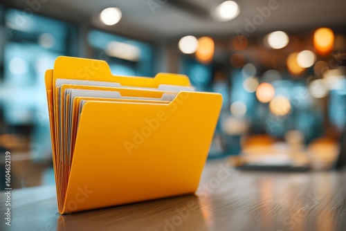 A set of yellow file folders neatly arranged on a wooden desk with a blurred office background featuring warm lights.