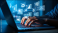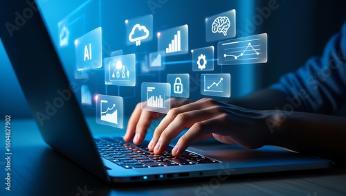 Fototapeta - Person typing on a laptop with glowing digital interface and data visualizations