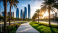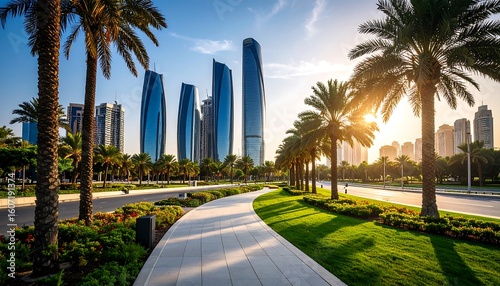 Abu Dhabi skyline with modern architecture, palm trees and walkway during golden hour