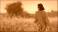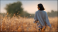 A woman strolls through a golden field at sunset, enjoying the tranquil moment.