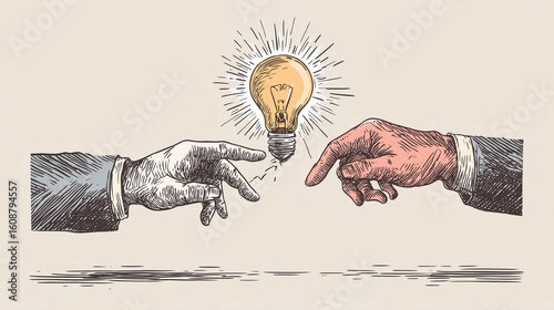 Fototapeta - Wymiana innowacyjnych pomysłów - koncepcja biznesowej współpracy. Dłonie i żarówka. Wektorowa ilustracja symbolizująca transfer wiedzy, burza mózgów, kreatywne rozwiązania i partnerstwo w biznesie.