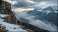 >Naklejka na meble>A dramatic view from a rocky ledge overlooking a mist-covered mountain valley, with snow-dusted peaks beyond. The sky is overcast, and the diffused light highlights the textures of the snow and rock.