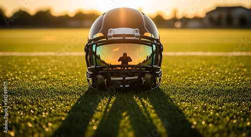 Fototapeta - American football helmet sits on green grass field at sunset with reflection of player in visor