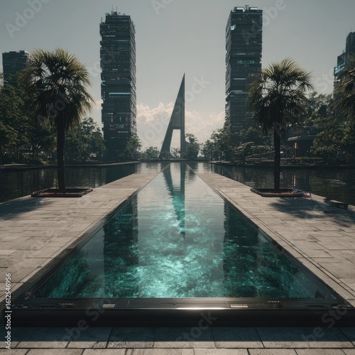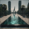 A tranquil, futuristic oasis with a long reflecting pool, flanked by palm trees and towering skyscrapers under a hazy sky