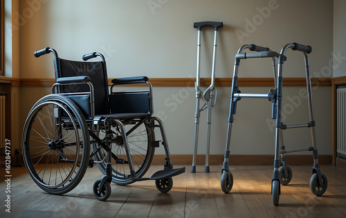 Fototapeta - Streamlined 3D Render of Wheelchair, Walker, Crutches