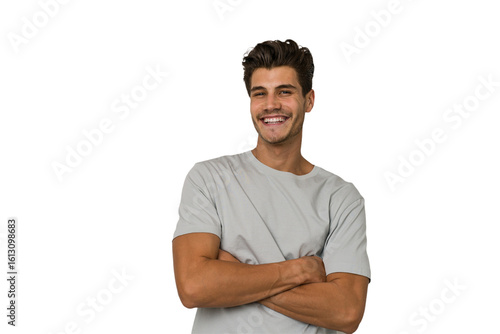 Young handsome caucasian man isolated on white background who feels confident, crossing arms with determination.