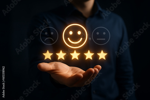 >Naklejka na meble>Businessman presenting five star rating and happy face, customer satisfaction and positive feedback concept for quality service and review