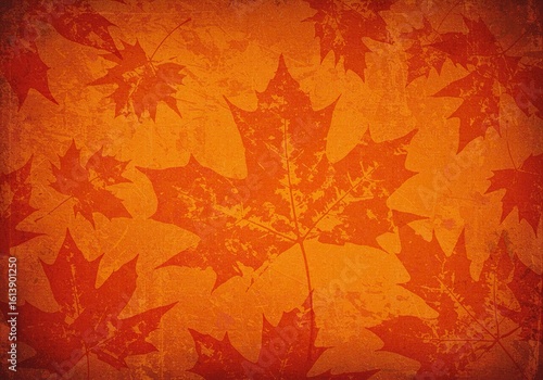 Autumn maple leaves create a textured, grungestyle background in warm orange and red hues