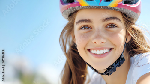 Fototapeta - A cheerful young girl wearing a colorful helmet enjoys a sunny day while riding her bike, embodying a spirit of adventure.