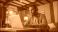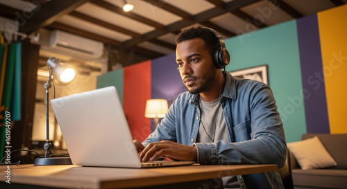 Man with headphones using laptop at desk with lamp in colorful room working or studying online