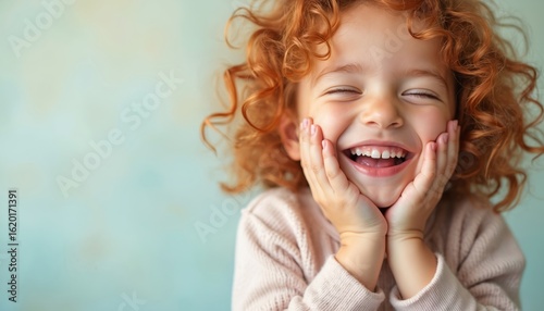 Joyful child with curly red hair smiles wide holding cheeks in pastel setting. Captures pure happiness, innocence, youthful spirit. Close-up view of delighted child experiencing genuine emotion,