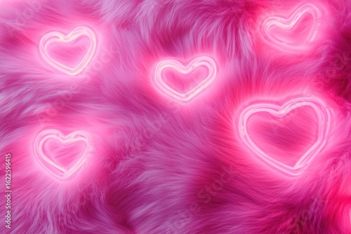 Top view of glowing pink neon hearts on soft fluffy faux fur background. Playful Valentine vibe. Feminine, cozy, romantic and trendy flatlay for love-themed design. Bright and cheerful mood. Banner
