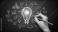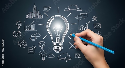 Hand sketching a bright light bulb surrounded by a diverse array of business and tech concept icons on a chalkboard.