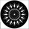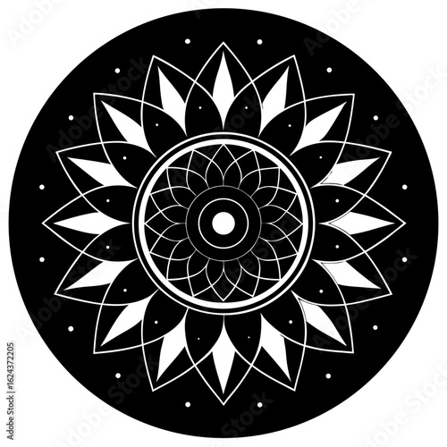 Stylized black and white mandala with floral petals and geometric center, isolated on white background