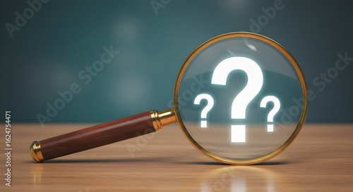 Fototapeta - Magnifying glass illuminating a large glowing question mark. Represents inquiry, searching for answers, problem-solving, and curiosity.