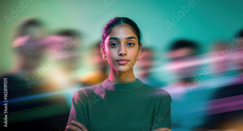 Fototapeta - Focused young Indian female leader with her team, facing camera in vibrant teal green and pink motion blur streaks