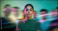 Focused young Indian female leader with her team, facing camera in vibrant teal green and pink motion blur streaks