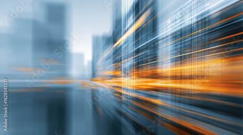 Abstract cityscape with motion blur. Urban scene, blurred buildings, streaks of orange and blue light, dynamic perspective