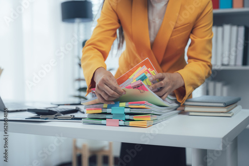 >Naklejka na meble>A businesswoman is working with a large pile of paperwork, searching for unfinished documents, information on piles of documents on her desk, and checking financial documents amidst her busy workload.