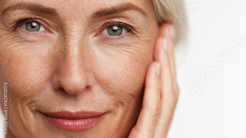 >Naklejka na meble>50s middle aged old woman looking at camera isolated on white background advertising dry skin care treatment anti age skincare beauty plastic surgery cosmetology procedures close up half face view no