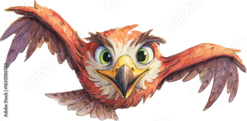 Whimsical watercolor owl in flight with wide eyes isolated on transparent background