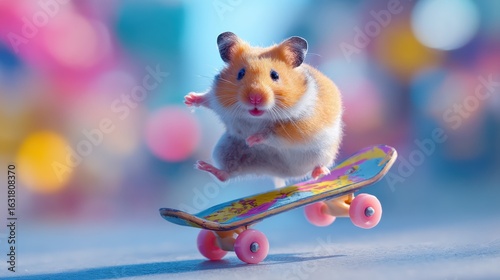 funny hamster rides a tiny skateboard, balancing with a playful expression, showcasing a whimsical and humorous animal adventure