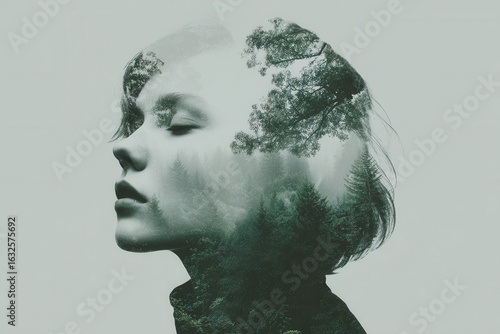 Profile of pensive woman with double exposure of evergreen forest landscape