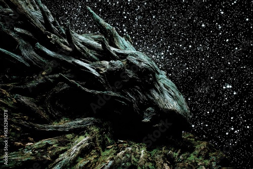 Ancient tree roots, dragon-like, against a star-filled night sky