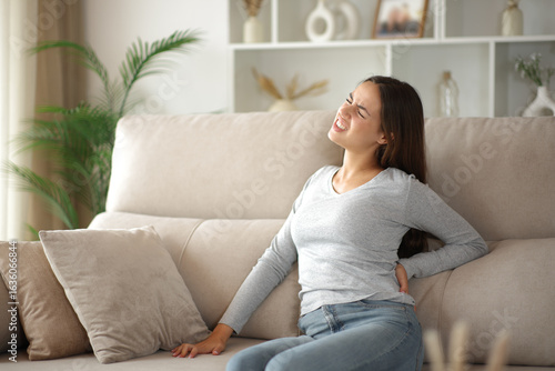 Fototapeta - Woman complaining suffering back ache on uncomfortable sofa