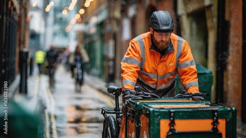 Fototapeta - Medium shot of a compostcollection courier adjusting cargo bike compartments main subject in clear detail with indistinct urban alley and pedestrians blurred in the background.