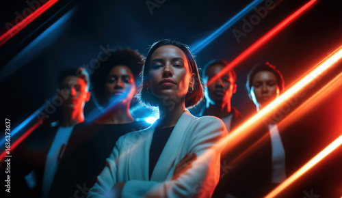 Fototapeta - Female business leader with intense look surrounded by team and streaks of futuristic red and blue neon light