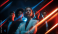 Female business leader with intense look surrounded by team and streaks of futuristic red and blue neon light