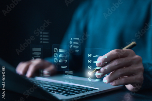Fototapeta - Digital checklist and task management concept with a man using a laptop and pen to interact with a virtual interface for productivity, planning, and project organization. checklist document