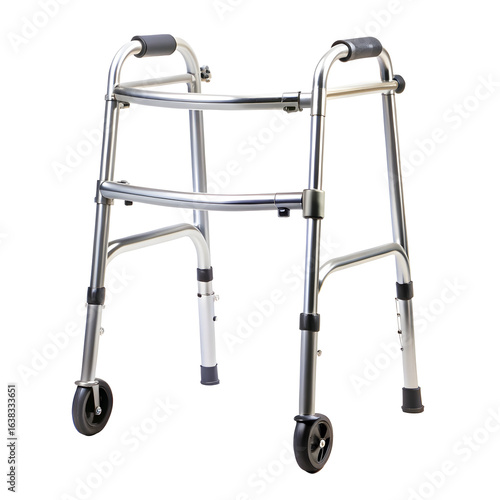 Fototapeta - Silver walker with black grips and wheels isolated on a transparent background