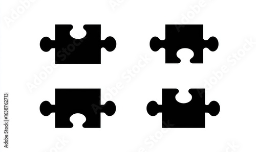 Fototapeta - Four solid black jigsaw puzzle pieces arranged in a 2x2 grid against a plain white background. Each piece features the characteristic interlocking shapes