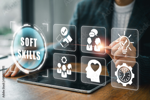 Fototapeta - Business professional using digital interface to highlight essential soft skills for effective communication and teamwork.