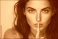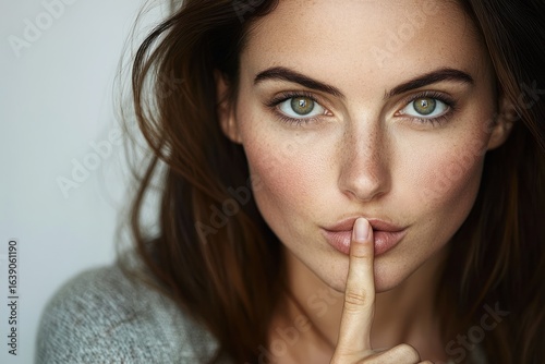 Close-up portrait of a young woman with green eyes and freckles giving a silent gesture with her finger on lips in soft natural light