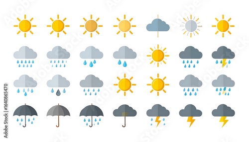 Fototapeta - Various weather icons displayed on a white background.