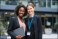 Happy businesswomen standing together with laptop outdoors