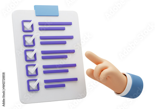 Fototapeta - チェックマーク付きのクリップボードを指す手 透明な背景に紫色のリスト 3D レンダリング