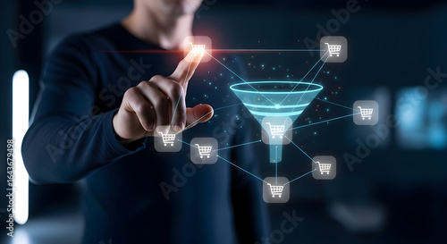 Man interacts with digital sales funnel concept: boost conversions and online marketing