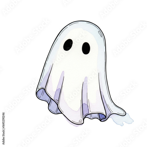 Fototapeta - A cute cartoon ghost with a white sheet and black eyes.