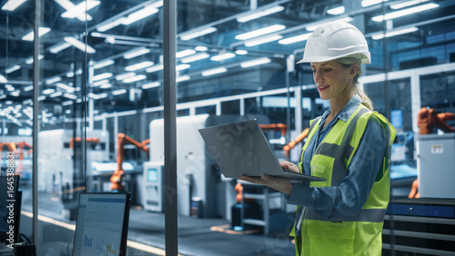 >Naklejka na meble>Factory Office: Portrait of Confident Caucasian Female Chief Engineer Wearing Hard Hat Working on Laptop Computer. Technician At Automated Robot Arm Assembly Line Manufacturing Electric Components