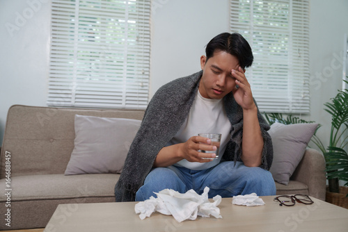 Fototapeta - Sick young man suffering from headache holding glass of water at home