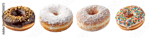 Delicious assorted donuts chocolate and powdered sprinkles on transparent background